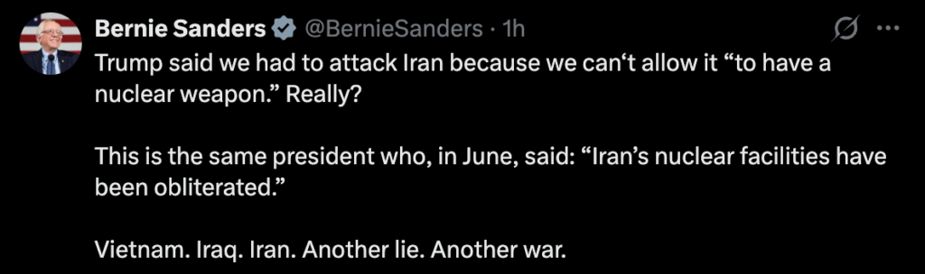 سندرز با انتشار پیامی در شبکه اجتماعی اکس (توییتر سابق)، استدلال ترامپ مبنی بر اینکه «باید به ایران حمله کرد تا به سلاح هستهای نرسد» را زیر سؤال برد. او با یادآوری سخنان پیشین رئیسجمهور آمریکا نوشت: «جدی؟ این همان رئیسی است که همین چند ماه پیش در ماه ژوئن ادعا کرد تأسیسات هستهای ایران بهطور کامل نابود شده است!»
